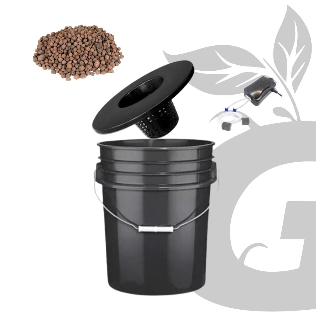 | Componentes | x1 Cubeta Plástica 19 Lts x1 Canastilla Hidropónica x1 Bomba de aire 180Lts x1 Clay Pebbles 2Lts Grow¡t |
